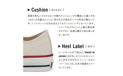 【ヒールラベル(ロゴ)】ヒールラベルの下部分に「MADE IN JAPAN」を印字。ホワイトのキャンバスに赤字で印されたインソールのコンバースロゴは、日本の国旗をイメージしています。