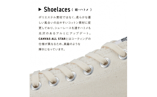 【シューレース(紐)ハトメ】シューレースは、ポリエステル素材ではなく、柔らかな優しい風合いの出やすいコットン素材に変更しており、シューレースを通すハトメも光沢のあるアルミにアップデート。CANVAS ALL STARとはコーティングの仕様が異なるため、真鍮のような輝きになっています。