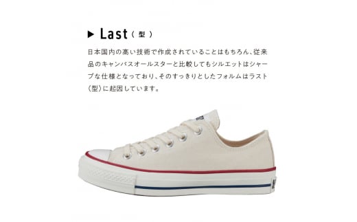 【ラスト(型)】特徴としては、日本国内の高い技術で作成されていることはもちろん従来品のキャンバスオールスターと比較してもシルエットはシャープな仕様となっており、そのすっきりとしたフォルムはラスト(型)に起因しています。