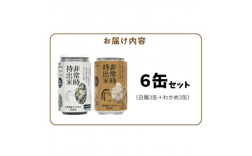 非常時持出米 白飯×3、わかめごはん×3 【6缶セット】 長期保存食 防災食 備蓄用_非常時持出米 白飯 わかめごはん【セット】 長期保存食 防災食 備蓄用 非常食 8年 保存 保存食 備蓄食 防災 防災用品 防災グッズ 米 白米 おにぎり 缶 セット わかめ 避難グッズ レジャー アウトドア キャンプ 常温 久留米市 送料無料_Ca235
