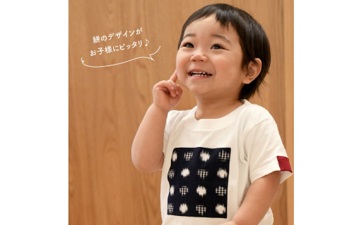 7. 風のおくりもの子供Tシャツ・白(サイズ110)_久留米絣 子供 Tシャツ 白 サイズ 110 綿100% 白地 水玉格子柄 濃紺 左袖 赤 絣 アクセント 伝統工芸品 優しい 肌ざわり 衣料品 服 伝統 工芸品 洋服 キッズ 男の子 女の子 風のおくりもの お取り寄せ 福岡県 久留米市 送料無料_Qk011-4