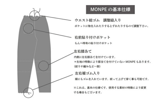 「もんぺ」というと腰回りのゆったりした農作業着のイメージがありますが、普段履きしやすい様に、既存のもんぺと比較して腰回りをすっきりさせ細身にしています。もちろん農作業着としてもご使用いただけます。