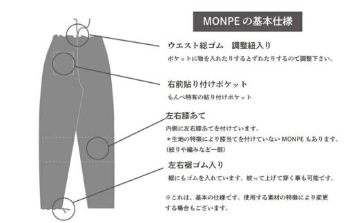 昔ながらのもんぺの形に近い全体的にゆったりしたラインのもんぺです。うなぎの寝床が開発したスリムタイプの現代風MONPEと比べてお尻周りはゆったり、膝からふくらはぎもすべて幅が広いシルエットになっています。ゆったり穿きたい方や作業や運動で使われる方、現代風MONPEの膝下の細さが気になる方などにおすすめです。