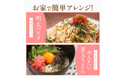 そのままでお酒の肴やご飯にはもちろん、明太パスタ、おにぎり、明太トースト、卵焼き、もつ鍋にいれたり、相性の良いマヨネーズやチーズと混ぜたソース作りにもお使いください。
