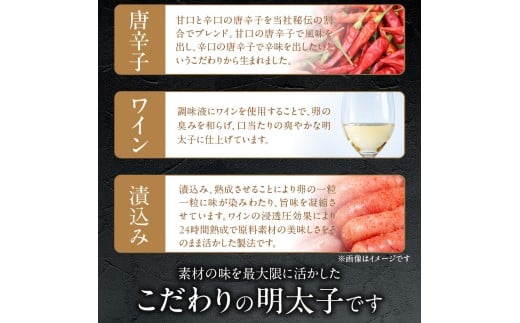 1957年創業の老舗の明太子メーカーがこだわって作り上げた秘伝の調味液にしっかり漬け込みました。