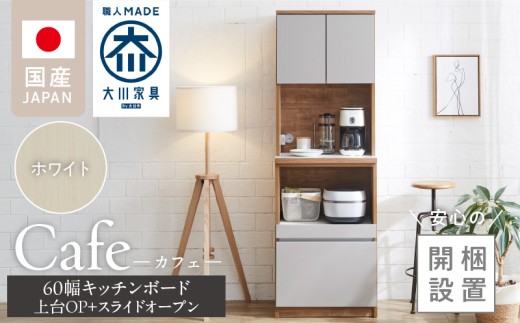 【開梱設置】キッチンボード カフェ60 60上台(OP)+スライドオープン(ホワイト)_開梱設置 キッチンボード カフェ 60 大川家具 上台OP 下台 スライドオープン ホワイト 耐震ダボ 可動棚 扉 引出し 収納 コンセント付き キッチン 家具 国内製造 お取り寄せ 福岡県 久留米市_Qd094-04