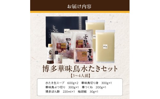 博多華味鳥水たきセット3~4人前 柚胡椒付_博多 華味鳥 水たき セット 3人前 ~ 4人前 柚胡椒付 水たき生スープ 切り身 ぶつ切り 華つくね 肉質 はっきりとした 旨み 歯ごたえ 水たき料亭 博多華味鳥 吟味 スープ 素材 オリジナル ぽん酢 鍋 お取り寄せ 福岡県 久留米市 送料無料_Cn025