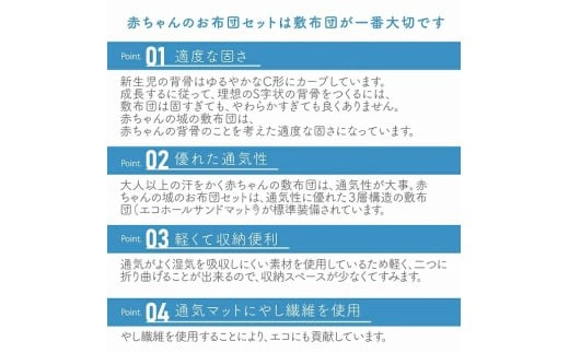 ・赤ちゃんはとても汗っかき。大人の2倍以上の汗をかくとも言われています。赤ちゃんの城が独自開発した「エコホールサンドマット」は通気性に優れた三層構造の敷布団。敷布団の赤ちゃんが触れる面にたくさんの通気口がありそこから、湿気をすって横から逃がす構造になっています。