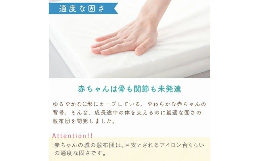 ・赤ちゃんの背骨はおなかの中ではゆるやかなCの字になっています。生まれてきて初めて平らなところで寝ます。その時、もしお布団がやわらかいと赤ちゃんのおしりや背骨が沈み込んで深いCの字になり、不自然な状態になります。だから、赤ちゃんの敷布団は適度な固さが必要と言われています。