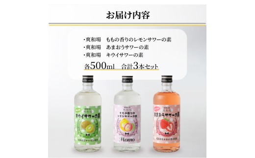 爽和場(サワーバー)飲み比べ3本セット _ 爽和場 サワーバー 飲み比べ 500ml 3本 レモンサワーの素 割るだけ 糖類ゼロ プリン体ゼロ フレーバー レモン もも キウイ あまおう レモンサワー サワー リキュール お酒 福岡県 久留米市 送料無料 _Ew006-1