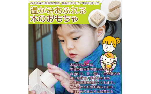 入れ物は西予市産の杉、おもちゃは西予市産のヒノキのみを使用した100%西予市の木のおもちゃです。