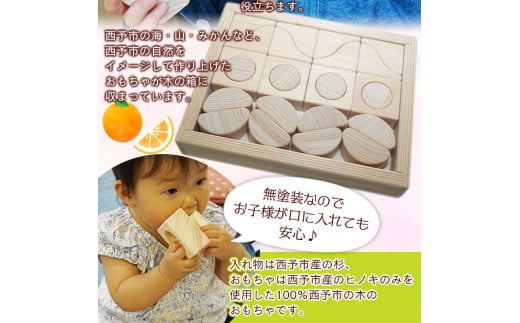 西予市の海・山・みかんなど、西予市の自然をイメージして作り上げたおもちゃが木の箱に収まっており、積み上げたり音を鳴らしたり、箱に納めてみたりと知育にも役立ちます。