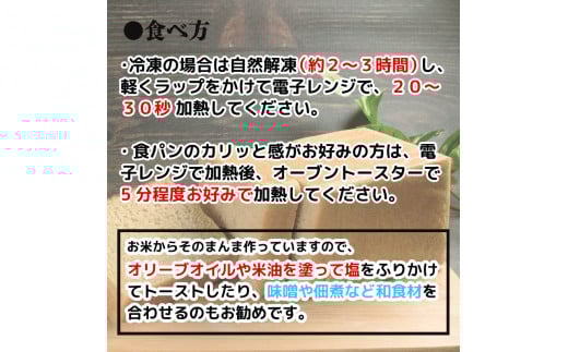 小麦のパンは焼きたてが一番おいしいのですが、「そのまんまお米ぱん」は冷凍庫での保存をおすすめしています。冷蔵庫で解凍後、トーストしてお召し上がりください。