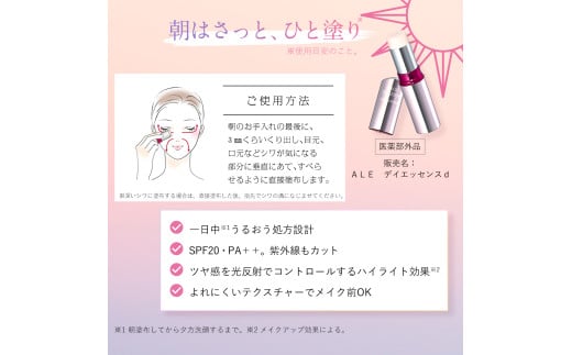 また、これ1本で日中のマルチケア。紫外線をカット(SPF20,PA++)し、乾燥から肌を守ります。ブライトレフレックス配合で、光を反射してツヤ感を与え、美しい肌を演出します。