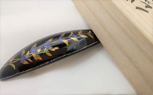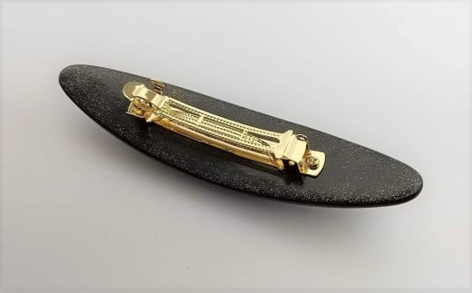 楕円形のヒノキの木地に何度も漆を塗り重ねて作った黒漆のバレッタです。