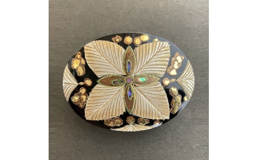 楕円型の本べっ甲に古代から続く花菱文様を肉上げし、金と貝とプラチナ箔を数枚貼り重ねて、華やかさと品格が感じられる一品になりました。