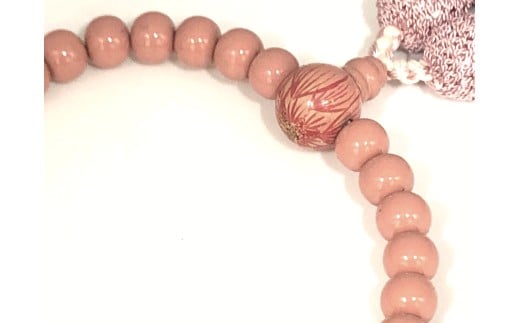 泥中から美しい花を咲かせる蓮花の蒔絵と桃色の優しい色合いの漆で仕上げたとても可愛らしい女性念珠です。