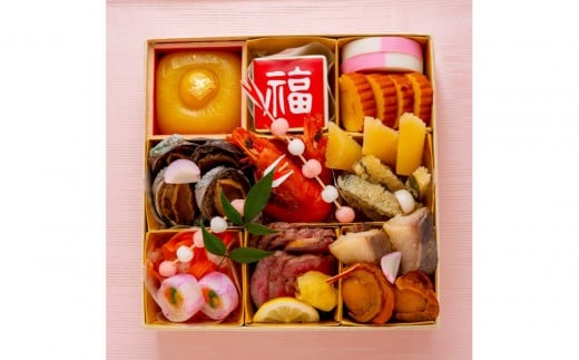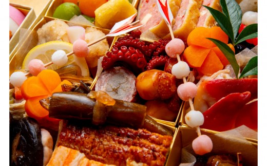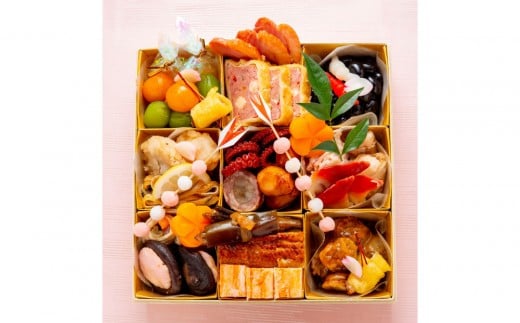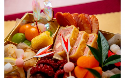 黒豆蜜煮・鴨白味噌・ミートパイ・ミニオーロラカスタード・金柑・皐月桃・鮟鱇黒酢南蛮漬・河豚皮ポン酢・湯葉三色・飾り陣笠・子持公魚昆布巻き・鰻柳川新丈・蟹テリーヌ・トリュフ松風・噴火湾産帆立松前・ホッキコンフィ・金目鯛吟醸味噌・小鯛俵焼き・蛸柔らか煮・牛肉午房巻き・子持ちいか