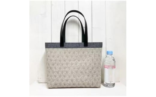 リネン 革持ち手刺し子トートバッグ&バッグinバッグ (A4横長タイプ グレー麻の葉柄)