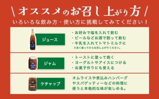 完熟ミニトマトをギュっと絞った濃厚なジュースと甘いジャム、トマトが香るケチャップのセット