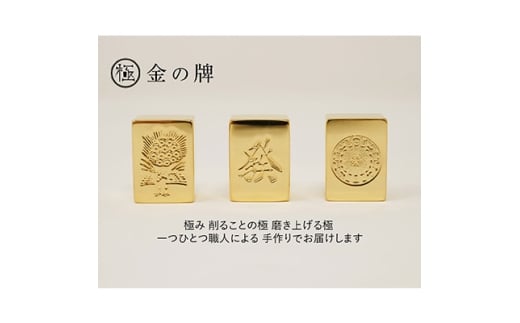 業務用の精密部品加工機を使用し、精巧に彫刻された牌を一つひとつ職人が妥協を許さず、全ての面・角を手作業で丁寧に磨き上げ、24金メッキで仕上げています。
