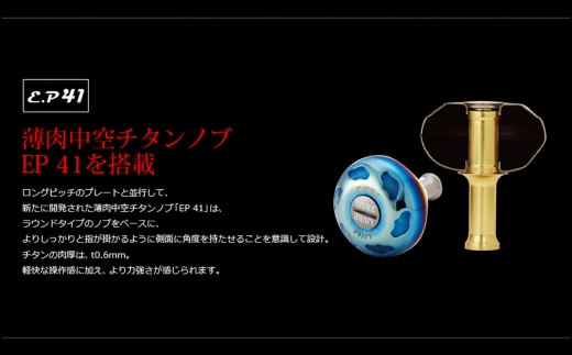 ロングピッチのプレートと並行して、新たに開発された薄肉中空チタンノブ「EP 41」は、ラウンドタイプのノブをベースに、よりしっかりと指が掛かるように側面に角度を持たせることを意識して設計。