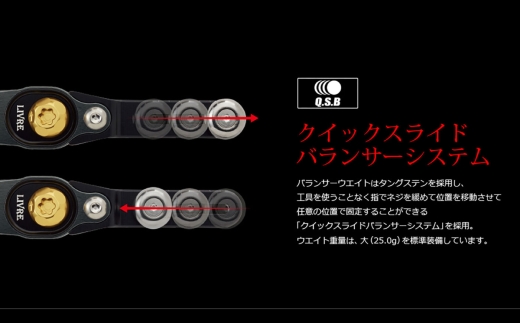 バランサーウエイトはタングステンを採用し、工具を使うことなく指でネジを緩めて位置を移動させて任意の位置で固定することが出来る「クイックスライドバランサーシステム」を採用。