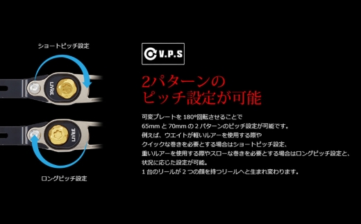 例えば、ウエイトが軽いルアーを使用する際や、クイックな巻きを必要とする場合はショートピッチ設定、重いルアーを使用する際やスローな巻きを必要とする場合はロングピッチ設定と、状況に応じた設定が可能。