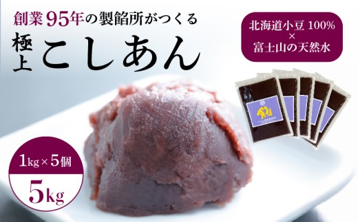 こしあん あんこ 5kg 大容量 和菓子 5袋 北海道産 小豆 国産 国内製造 富士山 伏流水 業務用 製餡所 専門店 パン作り あんバター あんぱん 菓子 菓子作り 製菓 老舗 手作り 美味しい 甘味 伝統 なめらか お土産 三島市 静岡県
