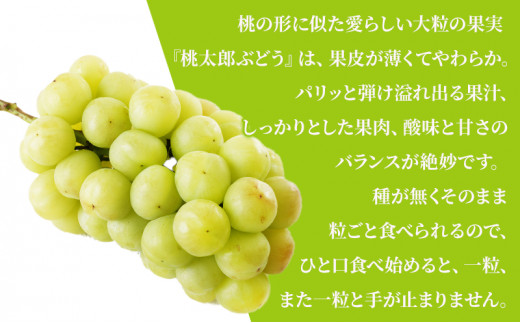 桃の形に似た愛らしい大粒の果実は、果皮が薄くてやわらか、しかも種が無いのでそのまま粒ごと食べられます。その手軽さからひと口食べ始めると、一粒、また一粒と手が止まりません。パリッと弾け溢れ出る果汁、しっかりとした果肉、酸味と甘さのバランスが絶妙な『桃太郎ぶどう』は大変人気のあるぶどうです。