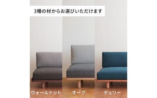 木製部分は、カバー生地やお部屋の雰囲気に合わせて、ウォールナット、オーク、チェリー材の3種類からお選びください。ウォールナット材は落ち着いた色調と美しい木肌で高級感があり、チェリー材は緻密でなめらかな木肌を持ち、経年変化で深く豊かな色合いが楽しめ、オーク材は明るい色味にはっきりとした木目の美しさが映える木材です。