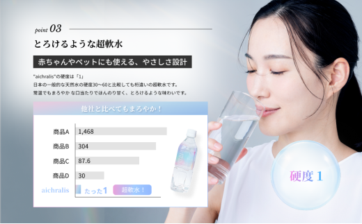 硬度1の超軟水、pH9.7~9.9のアルカリイオン水、シリカ・メタケイ酸を含むなど、様々な特徴を持っています。