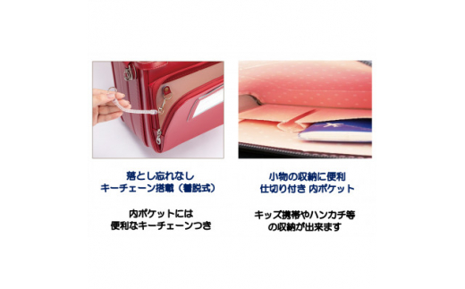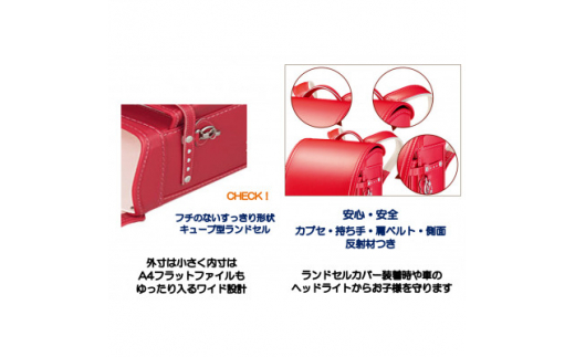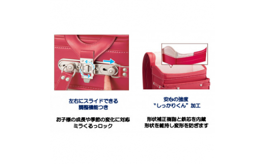 フチのないすっきりしたキューブ型なので従来品と比べ、体の小さなお子様や低学年の間もランドセルの大きさを感じずに背負えます。内寸はA4フラットファイルもゆったり収納可能な235mmワイドサイズを保持していますので、収納力があります。ベルト位置を左右にスライド出来るミラくるっロック採用で、お子様の体の成長や季節の変化に対応します。負担のかかる肩や背中部分には通気性とクッション性に優れた低反発素材を使用。背負った時の快適さが保たれ、教科書によるお子様の体への負担を軽減します。耐久性に優れたフィットちゃん金属製背カンを搭載しているので肩と背中に優しくフィットし、プラスティック製背カンとは違い、折れるなどの破損の心配がありません。両肩ベルト・側面・持ち手部分に反射素材を搭載している為、視認性が高く夜間時の使用も安心です。