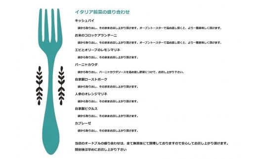 季節のオードブルセット(ニンジンのオレンジマリネ、水牛のモッツァレラチ-ズとチェリ-トマトのカプレ-ゼ、ベ-コンとタマネギのキッシュパイ、パルミジャ-ノチ-ズとトリュフ風味のお米のコロッケアランチ-ニ、自家製ピクルス、小エビとオリ-ブのレモンマリネ、国産豚ロ-スの自家製ロ-ストポ-ク、バ-ニャカウダ) 1セット