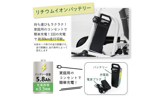 上品なホワイトカラーの電動アシスト三輪自転車 大人用18インチ