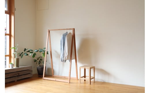折り畳み式ハンガーラックです。パーツごとに解体し、革紐でまとめることもできます。