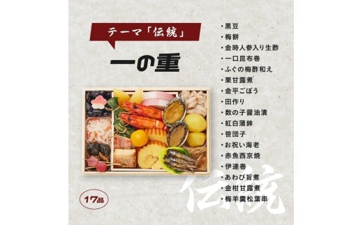 黒豆/梅餅/金時人参入り生酢/一口昆布巻/ふぐの梅酢和え/栗甘露煮/金平ごぼう/田作り/数の子醤油漬/紅白蒲鉾/笹団子/お祝い海老/赤魚西京焼/伊達巻/あわび旨煮/金柑甘露煮/梅羊羹松葉串
