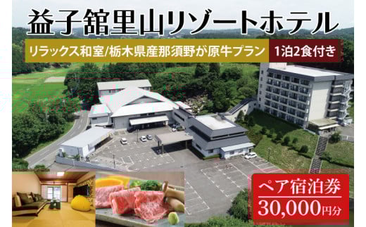 DP003 益子舘里山リゾートホテル ペア宿泊券 30,000円分 リラックス和室 栃木県産那須野が原牛プラン 1泊2食付き