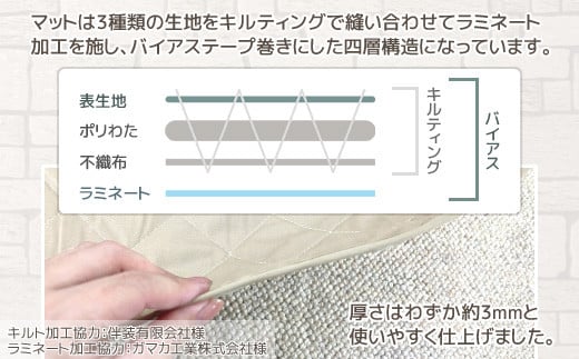 キルティング加工、防水ラミネート加工、周りバイアステープ巻き