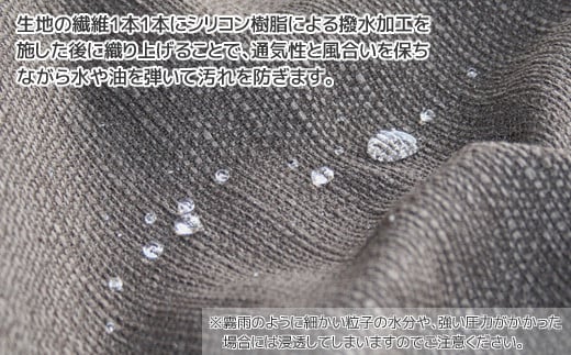 (※1:シリコン樹脂を繊維1本1本に付着するので、通気性も損なわれず、風合いを保ちつつ水や油をはじいて汚れも防ぎます。しかし霧雨のように細かい粒子の水分や強い圧力がかかった場合などにはどうしても水は浸透してしまいます)