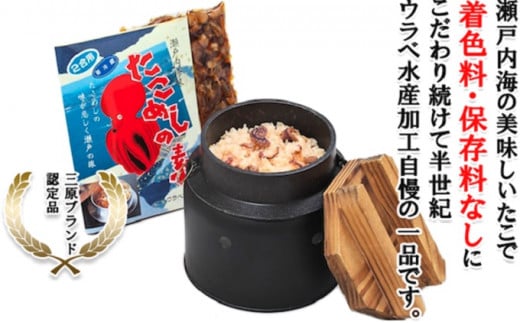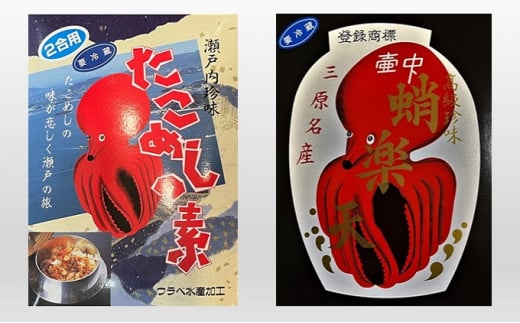 三原名物のたこを丸ごと味醂漬にした「たこ楽天」と、お米と一緒に炊くだけのカンタンで美味しい「たこ飯の素」のセットです。