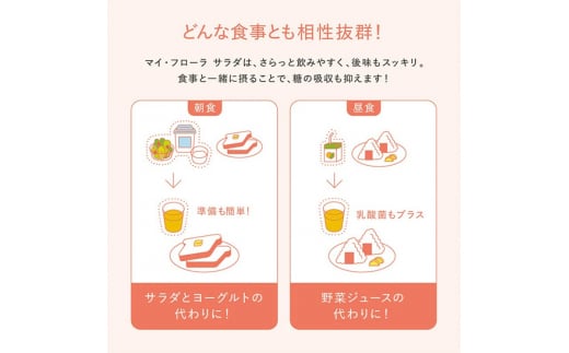 マイ・フローラ サラダは、ぶどう、にんじん、バナナ、もも、みかん、ビーツ、赤ピーマン、トマトといった果物や野菜を生命力の強い植物乳酸菌で発酵させた腸活ドリンク。