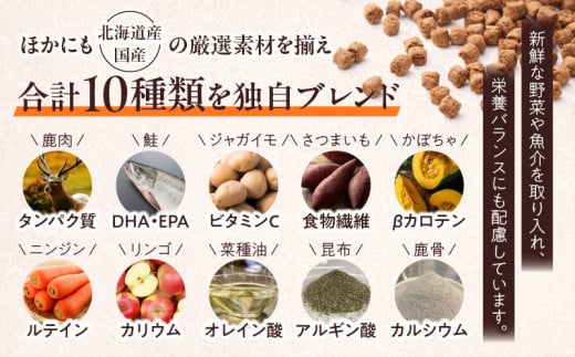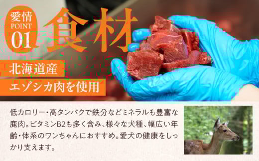 鹿肉、じゃがいも、鮭、カボチャ、サツマイモ、ニンジン、リンゴ、菜種油、鹿骨、昆布