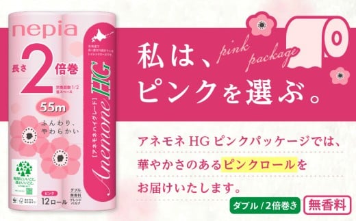 トイレットロール アネモネHG 12ロール ダブル 2倍巻(55m巻・無香料・ピンクパッケージ・ピンクロール)