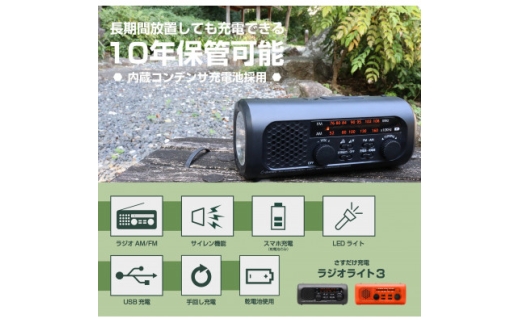 AM/FMラジオで正確な情報をキャッチでき、LEDライトとサイレン機能で備えて安心、家庭に1台あると心強いアイテムです。