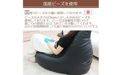 約95×50×40-85cmで大ビーズを使用しているので、軽量タイプ!しっかりと背もたれが支えてくれるので、くつろげます。むにゅむにゅとした独特な感触と、しっかりとした座り心地が特徴です。カラーバリエーションも5色あり、お好きなお色をお選び頂けます。一度座ると離れられなくなるので、ご注意ください!