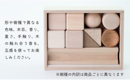・積み木の木材は、その時々に仕入れた九州産の木材の中から、色のバランスを考えて複数の樹種を使用しています。そのため、お届けする積み木のパーツは画像と樹種や木の色味が異なる場合がございます。