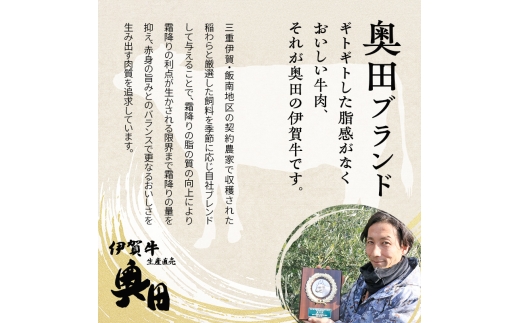奥田では、三重伊賀・飯南地区の契約農家で収穫された稲わらと厳選した飼料を季節に応じ自社ブレンドして与えることで、霜降りの脂の質の向上により霜降りの利点が生かされる限界まで霜降りの量を抑え、赤身の旨みとのバランスで更なるおいしさを生み出す肉質を追求してきています。