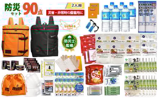 オリジナル非常用持ち出し袋×2、非常用ポーチ×2、アルミブランケット×2、米ぬかトイレ×10、レインコート×2、絆創膏×2セット、綿棒×2セット、防災の心得×2、不織布マスク×12、貼らないカイロ×4、5年保証ウェットティッシュ×2、ホイッスル×2、流せるティッシュ×2、六甲の水×6、五目おこわ×2、肉じゃが×2、チキンカレー×2、筑前煮×2、ビスコ×2、こうのとり育むお米×12、非常用給水バッグ×2、ホタルイカ×2、軍手×2、タオル×2、加熱材セット×8 の合計90点のセットです。