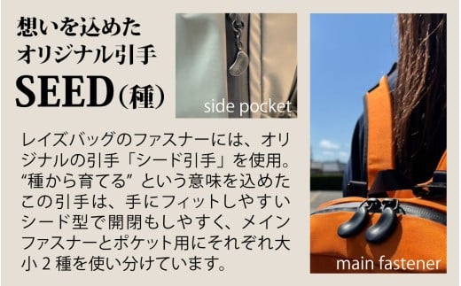 レイズバッグのファスナーには、オリジナルの「シード引手」を使用。